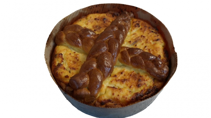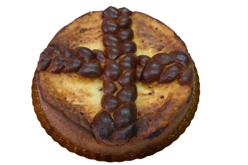 Pasca cu branza naturala si stafide specifica sarbatorilor de Paste. Pasca este rotunda iar deasupra se face o impletitura din aluat in forma de cruce.